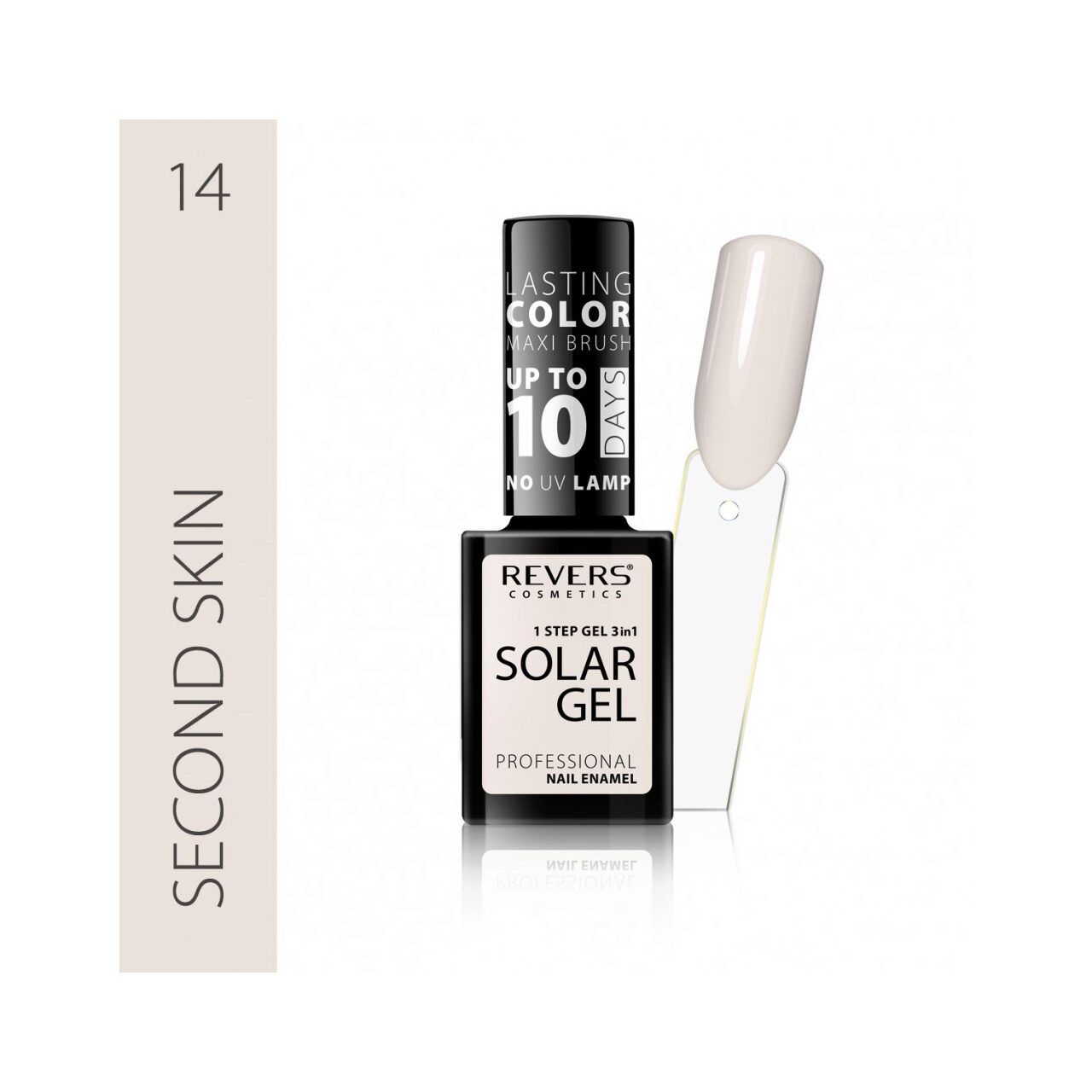 Lacul de unghii Solar Gel, Revers, nude, nr 14, second skin este o noua generatie de lac care combina proprietatile lacului traditional si ale celui hybrid. Nu necesita folosirea lampilor UV/Led, lacul de unghii uscandu-se la lumina naturala. Formula inovatoare, puternic pigmentata, asigura intarirea lacului de unghii, iar acesta devine rezistent la zgarieturi, poate fi folosit pentru o perioada indelungata si are aparenta unui gloss extrem de lucios – efectul vizual este cel al manechiurii cu gel. Lacul de unghii Solar Gel rezista pe unghii pana la 10 zile, fiind suficienta o singura aplicare. A doua aplicare asigura o durabilitate sporita, si un efect si mai glossy.