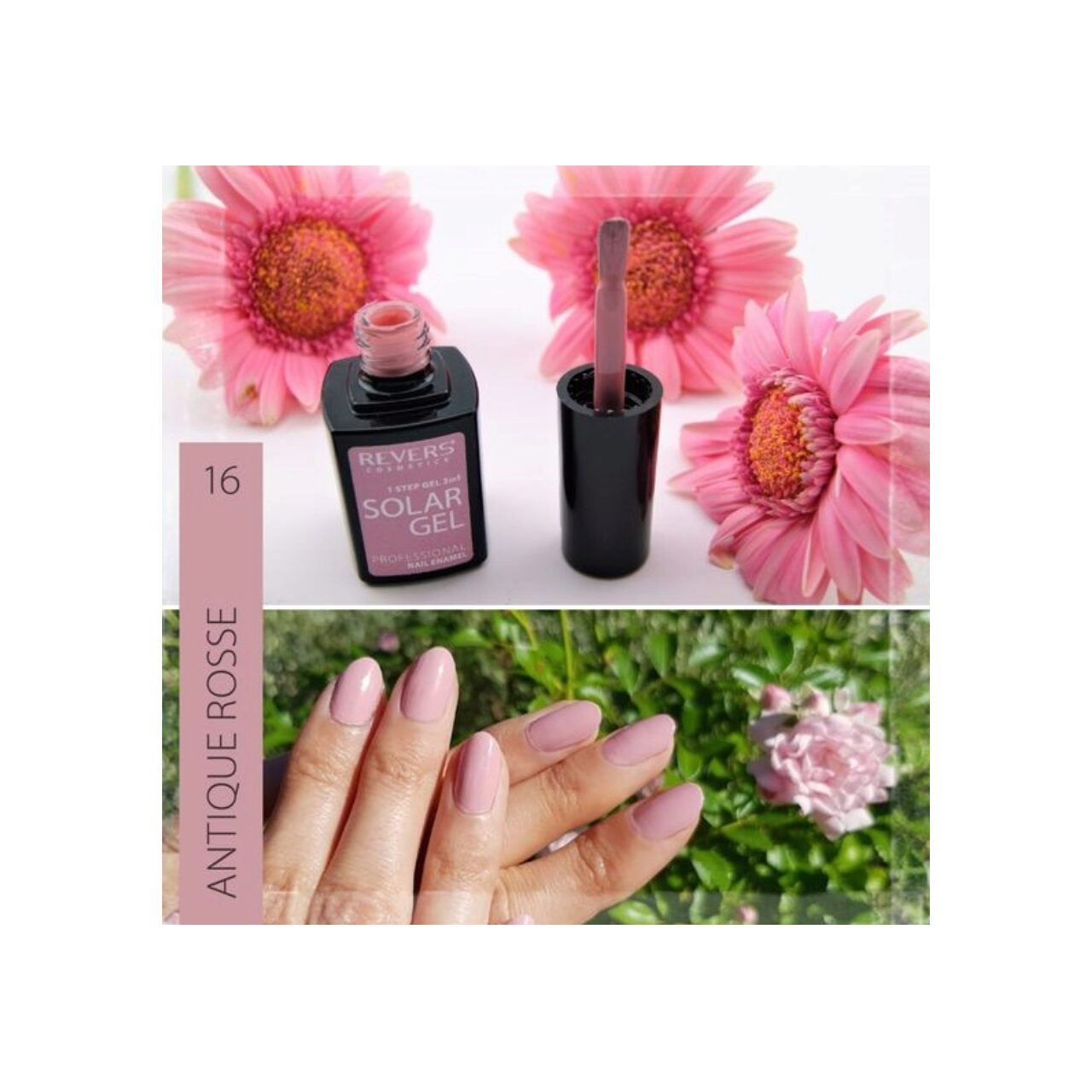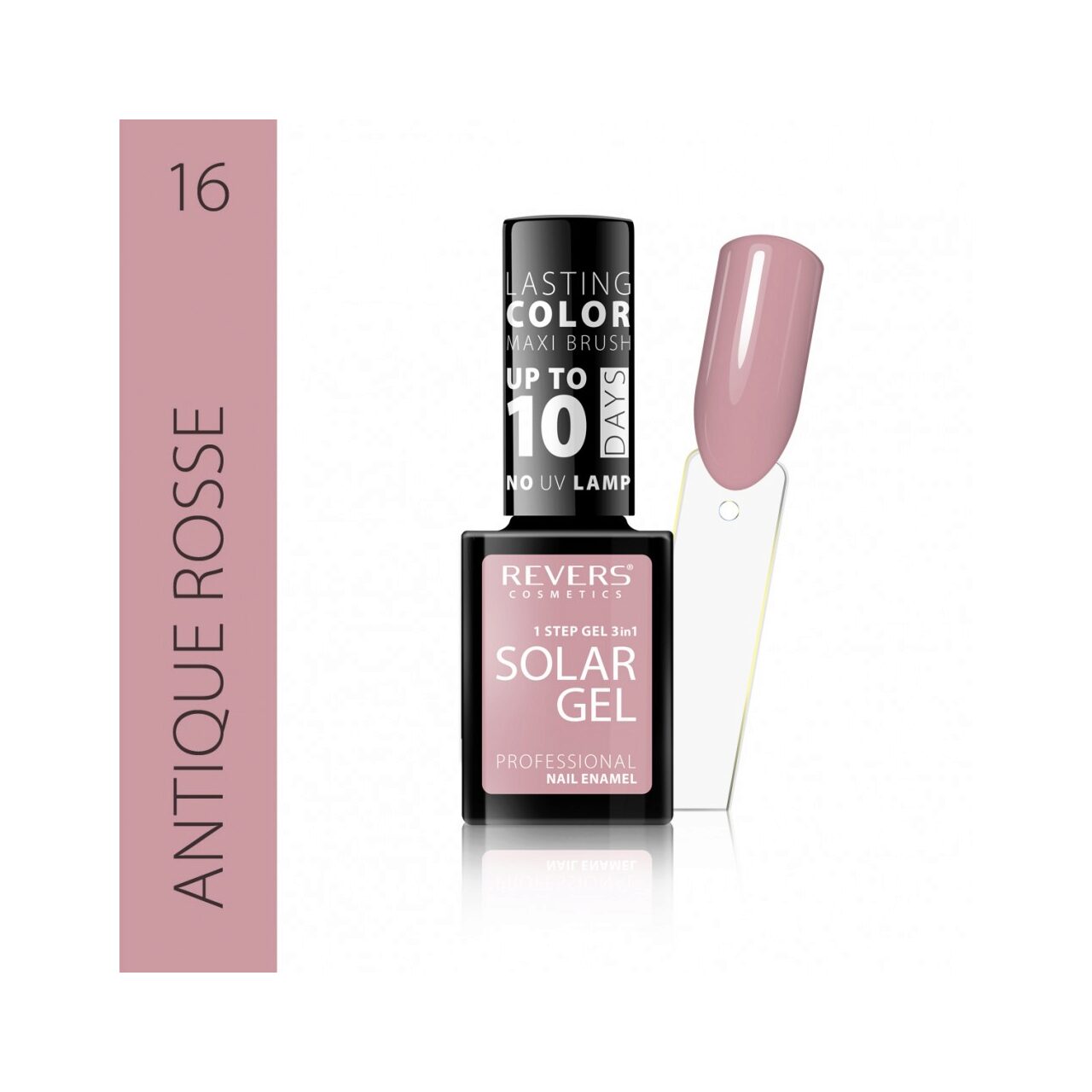 Lacul de unghii Solar Gel, Revers, nude, nr 16, antique rosse este o noua generatie de lac care combina proprietatile lacului traditional si ale celui hybrid. Nu necesita folosirea lampilor UV/Led, lacul de unghii uscandu-se la lumina naturala. Formula inovatoare, puternic pigmentata, asigura intarirea lacului de unghii, iar acesta devine rezistent la zgarieturi, poate fi folosit pentru o perioada indelungata si are aparenta unui gloss extrem de lucios – efectul vizual este cel al manechiurii cu gel. Lacul de unghii Solar Gel rezista pe unghii pana la 10 zile, fiind suficienta o singura aplicare. A doua aplicare asigura o durabilitate sporita, si un efect si mai glossy.