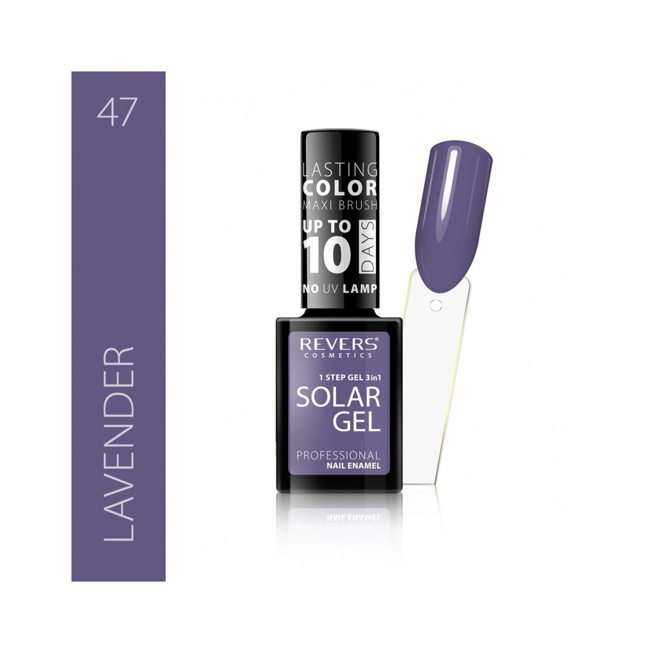 Lacul de unghii Solar Gel, Revers, mov , nr 47, lavander este o noua generatie de lac care combina proprietatile lacului traditional si ale celui hybrid. Nu necesita folosirea lampilor UV/Led, lacul de unghii uscandu-se la lumina naturala. Formula inovatoare, puternic pigmentata, asigura intarirea lacului de unghii, iar acesta devine rezistent la zgarieturi, poate fi folosit pentru o perioada indelungata si are aparenta unui gloss extrem de lucios – efectul vizual este cel al manechiurii cu gel. Lacul de unghii Solar Gel rezista pe unghii pana la 10 zile, fiind suficienta o singura aplicare. A doua aplicare asigura o durabilitate sporita, si un efect si mai glossy.