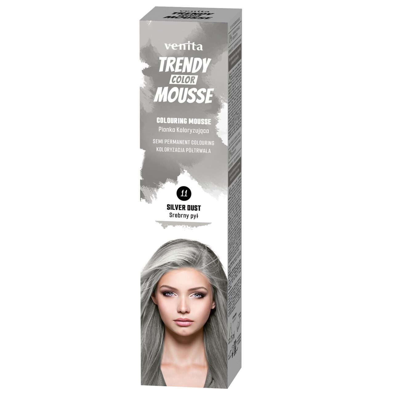 Spuma coloranta Trendy Nr. 11, Silver Dust, argintie, este o vopsea semipermanenta sub forma de spuma, special creata pentru cele care isi doresc sa iasa in evidenta, interesate in obtinerea unui efect unic si colorat! Formula blanda, fara amoniac si oxidanti, va permite sa modificati cu usurinta si in mod eficient culoarea parului, oferind o colorare vie.