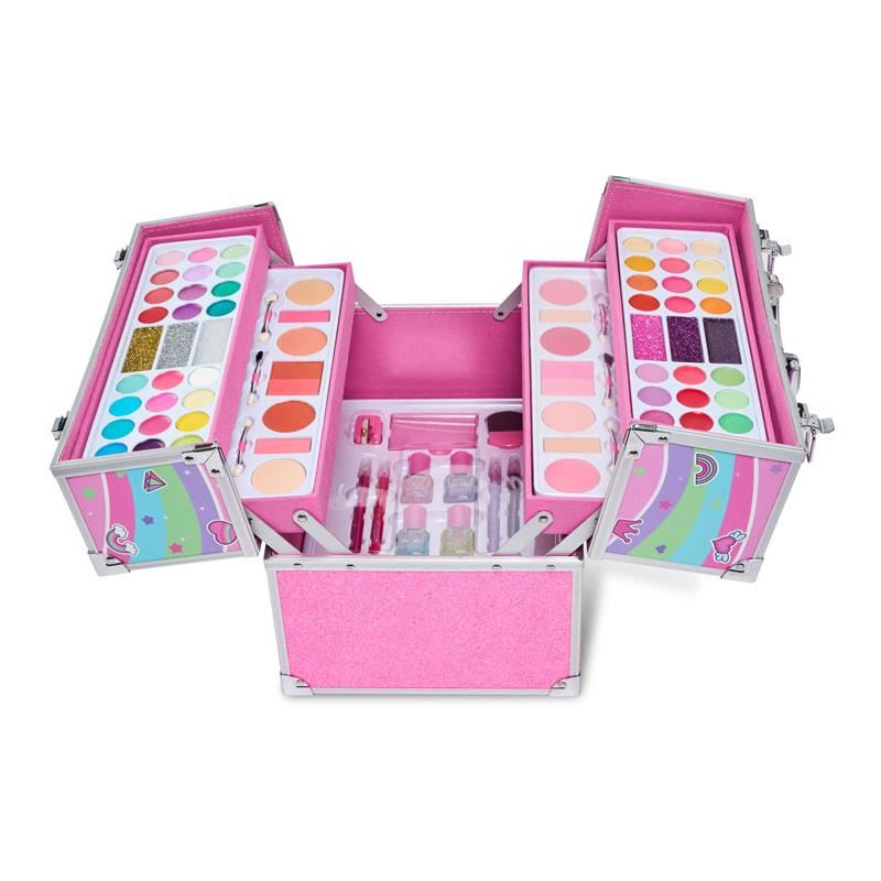 Trusa cosmetica Supergirl Fabulous Colors Martinelia, un set uimitor pentru domnisoare care se prezinta ca o cutie mare de machiaj pentru copii, cu 3 niveluri, cu detalii argintii, ce include 32 farduri de pleoape, 16 farduri de obraz si bronzante, 14 luciu de buze, 6 creme cu sclipici, 4 rujuri, 4 lacuri de unghii, 4 creioane de buze, 1 ascuțitoare, 7 aplicatoare, 1 oglinda.